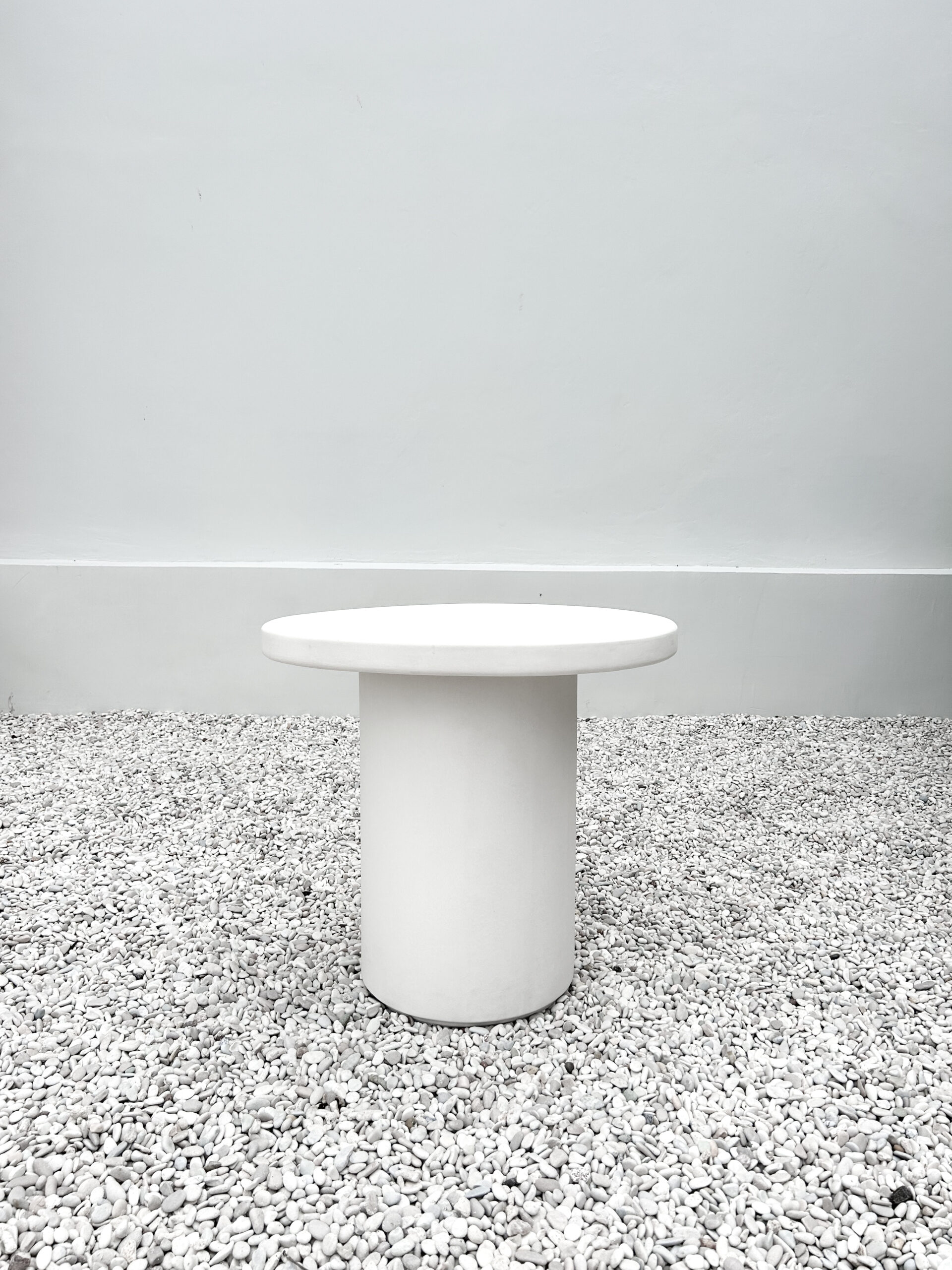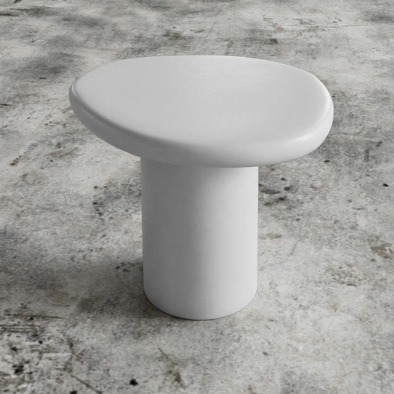 This organic side table features a clean, minimalist silhouette with a generous circular top and a solid cylindrical base, creating a strong yet understated presence.